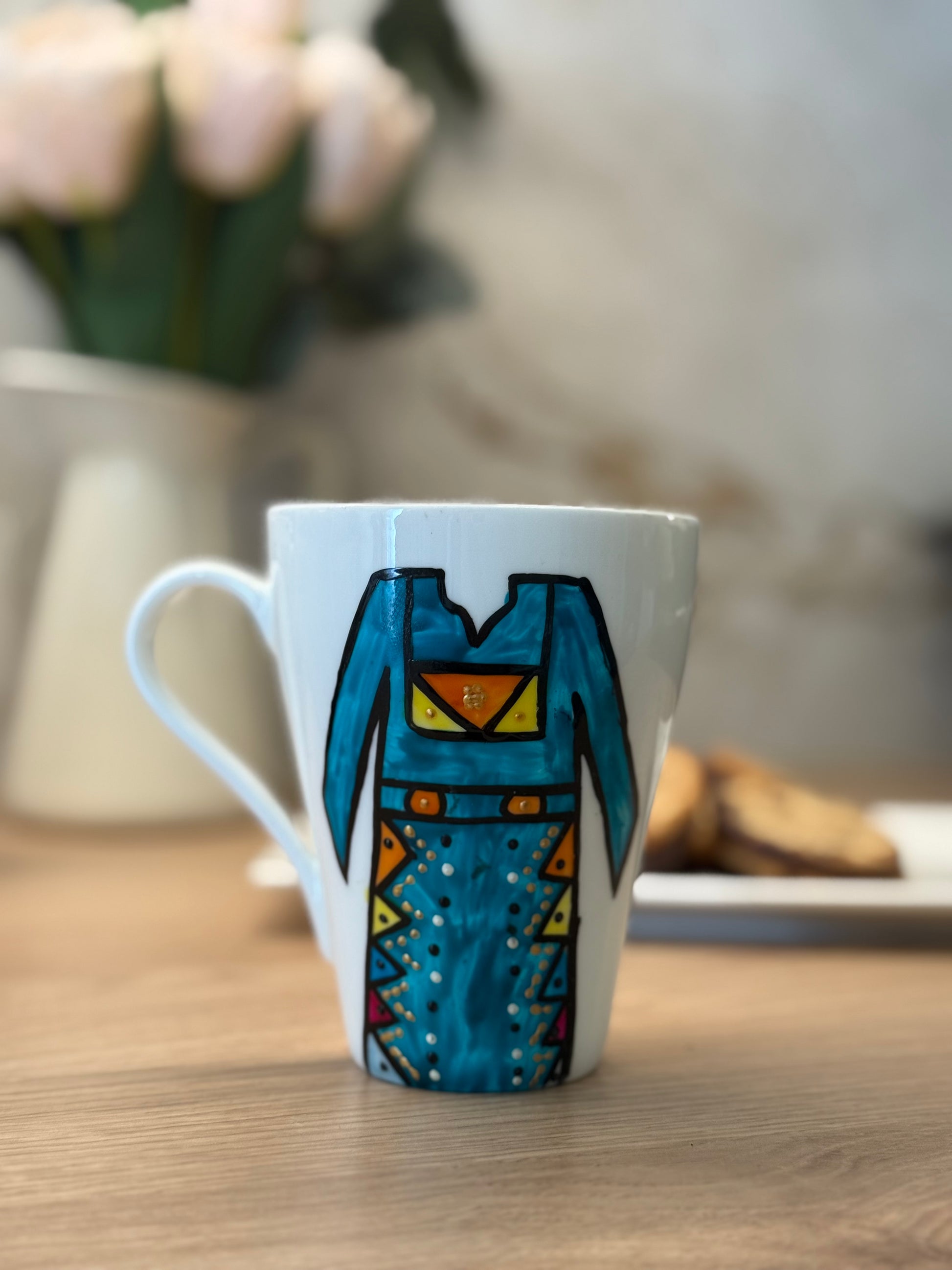 C'est au cours d'un de nos voyages en Jordanie, alors que nous allions nous sourcer auprès de nos chers fournisseurs de thobs, que nous sommes tombées sur ces mugs peints à la main, représentant des ... thobs ! Ce fut un coup de coeur direct! Notre fournisseur nous a alors raconté que ces mugs étaient à l'initiative d'une jeune femme issue des camps de refugiés Palestinien d'Amman. Elle est à la fois passionée de peinture et aussi de notre héritage palestinien qu'est le thob et qu'elle voulait mettre à l'honneur ! Nous avons adoré cette initiative, en plus d'avoir adoré ces mugs uniques ! Nous nous sommes tellement retrouvées dans sa mission de promotion de notre magnifique culture palestinienne ! Alors, nous en avons pris pour nous et pour vous !