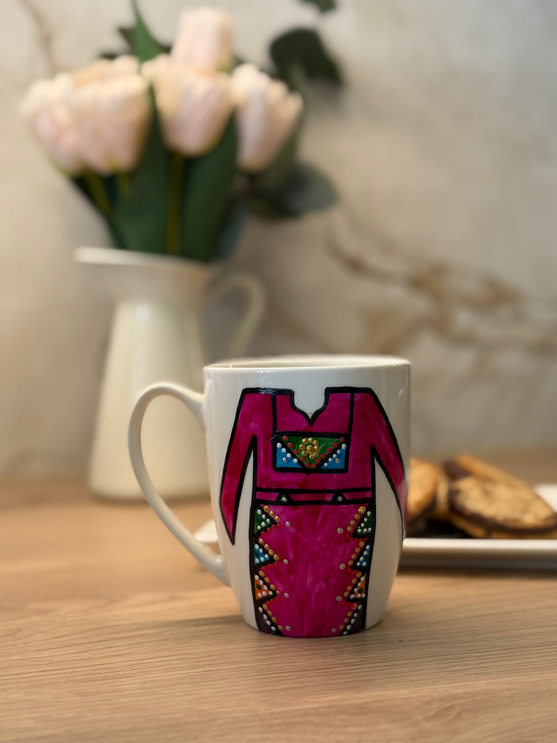 C'est au cours d'un de nos voyages en Jordanie, alors que nous allions nous sourcer auprès de nos chers fournisseurs de thobs, que nous sommes tombées sur ces mugs peints à la main, représentant des ... thobs ! Ce fut un coup de coeur direct! Notre fournisseur nous a alors raconté que ces mugs étaient à l'initiative d'une jeune femme issue des camps de refugiés Palestinien d'Amman. Elle est à la fois passionée de peinture et aussi de notre héritage palestinien qu'est le thob et qu'elle voulait mettre à l'honneur ! Nous avons adoré cette initiative, en plus d'avoir adoré ces mugs uniques ! Nous nous sommes tellement retrouvées dans sa mission de promotion de notre magnifique culture palestinienne ! Alors, nous en avons pris pour nous et pour vous !